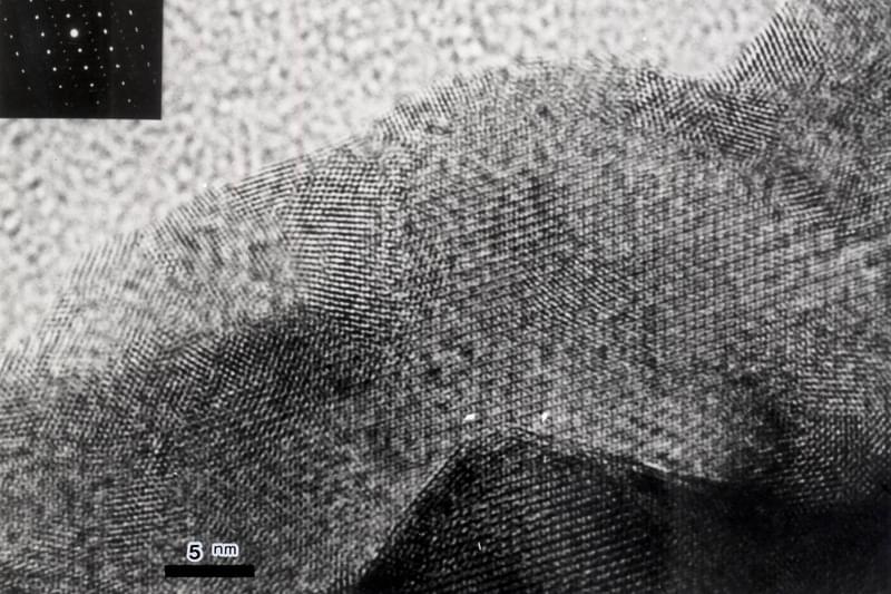 Y、Ba、Cu、O Powderを振りかけ方式でカーボン支持膜の上に分散、粒子の縁の部分を拡大したものである。この金属では結晶の重なりや結晶粒界のため、結晶格子が複雑に交錯している。左上の電子線回折パターンからは結晶形や結晶方位などを知られ、TEM像と合わせて試料の詳細な構造解析ができる。